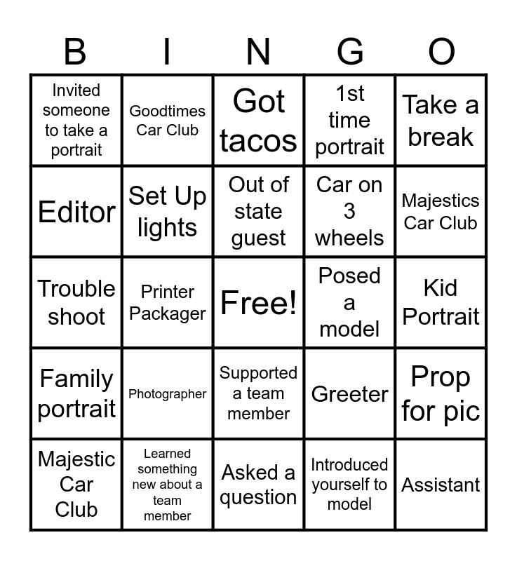 This bingo card has a free space and 24 words: Photographer, Learned something new about a team member, Out of state guest, Majestic Car Club, Take a break, Invited someone to take a portrait, Editor, Goodtimes Car Club, Posed a model, Supported a team member, Car on 3 wheels, Trouble shoot, Greeter, Prop for pic, Set Up lights, Introduced yourself to model, Kid Portrait, Got tacos, Majestics Car Club, Printer Packager, Assistant, Family portrait, 1st time portrait and Asked a question.