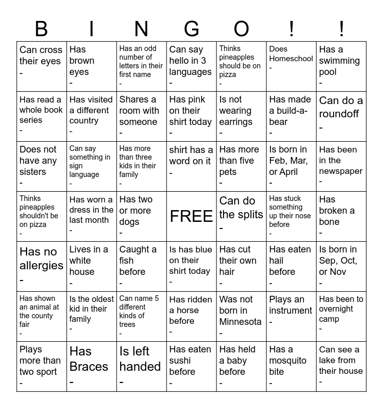 This bingo card has a free space and 48 words: Was not born in Minnesota -, Has made a build-a-bear -, Has eaten sushi before -, Has worn a dress in the last month -, Has more than three kids in their family -, Has broken a bone -, Has brown eyes -, Has Braces -, Does Homeschool -, Is has blue on their shirt today -, Has a swimming pool -, Can say hello in 3 languages -, Is born in Feb, Mar, or April -, Has more than five pets -, Has shown an animal at the county fair -, Has stuck something up their nose before -, Has read a whole book series -, Can do a roundoff -, Plays an instrument -, Thinks pineapples should be on pizza -, Is not wearing earrings -, Has two or more dogs -, Can cross their eyes -, Has visited a different country -, Has been to overnight camp -, Shares a room with someone -, Has been in the newspaper -, Plays more than two sport -, shirt has a word on it -, Can say something in sign language -, Has a mosquito bite -, Can do the splits -, Is born in Sep, Oct, or Nov -, Is the oldest kid in their family -, Thinks pineapples shouldn't be on pizza -, Has cut their own hair -, Has eaten hail before -, Does not have any sisters -, Caught a fish before -, Can name 5 different kinds of trees -, Has no allergies -, Can see a lake from their house -, Has an odd number of letters in their first name -, Is left handed -, Has pink on their shirt today -, Has ridden a horse before -, Lives in a white house - and Has held a baby before -.