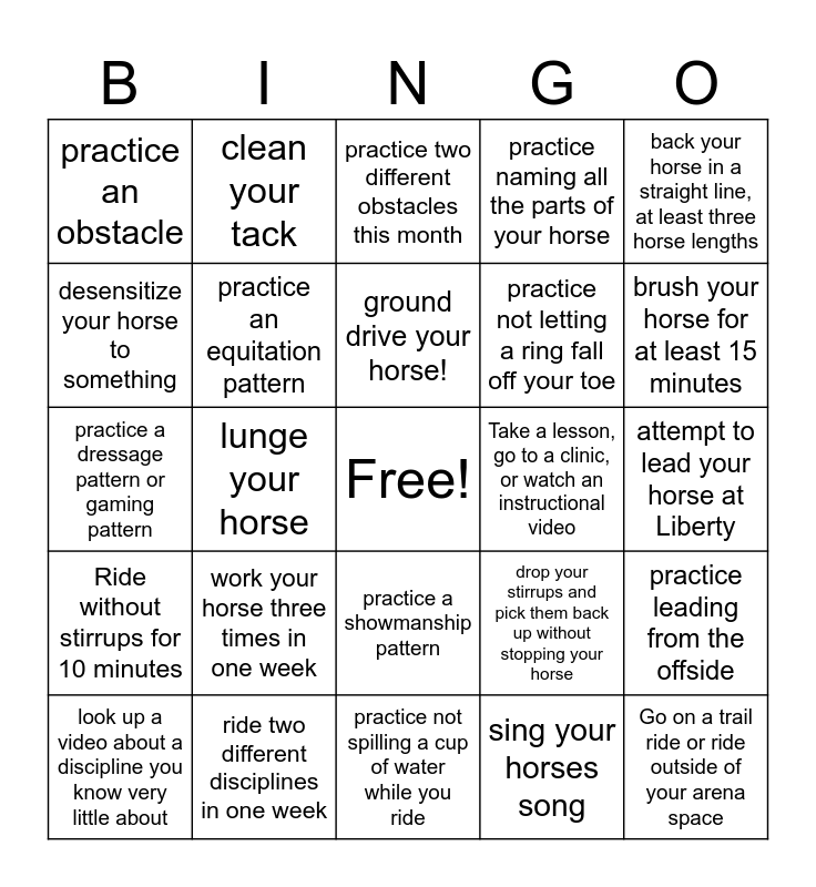This bingo card has a free space and 30 words: ride two different disciplines in one week, mount and dismount from the "wrong" side, lunge your horse, Ride bareback, practice an obstacle, practice two different obstacles this month, practice an equitation pattern, practice a showmanship pattern, Take a lesson, go to a clinic, or watch an instructional video, practice not spilling a cup of water while you ride, attempt to lead your horse at Liberty, Go on a trail ride or ride outside of your arena space, sing your horses song, practice a maneuver, brush your horse for at least 15 minutes, Ride two different horses this month, drop your stirrups and pick them back up without stopping your horse, Ride without stirrups for 10 minutes, work your horse three times in one week, back your horse in a straight line, at least three horse lengths, practice a dressage pattern or gaming pattern, trot your horse in hand in a straight line, clean your tack, practice not letting a ring fall off your toe, desensitize your horse to something, practice naming all the parts of your horse, practice leading from the offside, look up a video about a discipline you know very little about, ground drive your horse! and attempt to teach your horse a new trick.