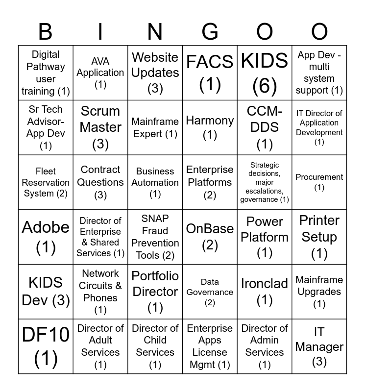 This bingo card has 45 words: Free!, Fleet Reservation System (2), Peoplesoft & iTravel (1), SNAP Fraud Prevention Tools (2), Data Governance (2), Printer Setup (1), Website Updates (3), CCMASS (1), KIDS (6), OnBase (2), FACS (1), Contract Questions (3), Procurement (1), Strategic decisions, major escalations, governance (1), Enterprise Apps License Mgmt (1), Power Platform (1), Mainframe Upgrades (1), CCM-DDS (1), WAM - (1), Harmony (1), AVA Application (1), DF10 (1), Ironclad (1), Digital Pathway user training (1), CXOne InContact (1), Business Automation (1), Network Circuits & Phones (1), Portal Change Enablement (1), Adobe (1), Enterprise Platforms (2), Director of Operations (1), Director of Enterprise & Shared Services (1), Director of Child Services (1), Director of Admin Services (1), Director of Adult Services (1), IT Director of Application Development (1), Portfolio Director (1), IT Manager (3), KIDS Dev (3), Scrum Master (3), App Dev - multi system support (1), Mainframe Expert (1), OKDHS Live App Dev (1), Sr Tech Advisor-App Dev (1) and CWIS (1).