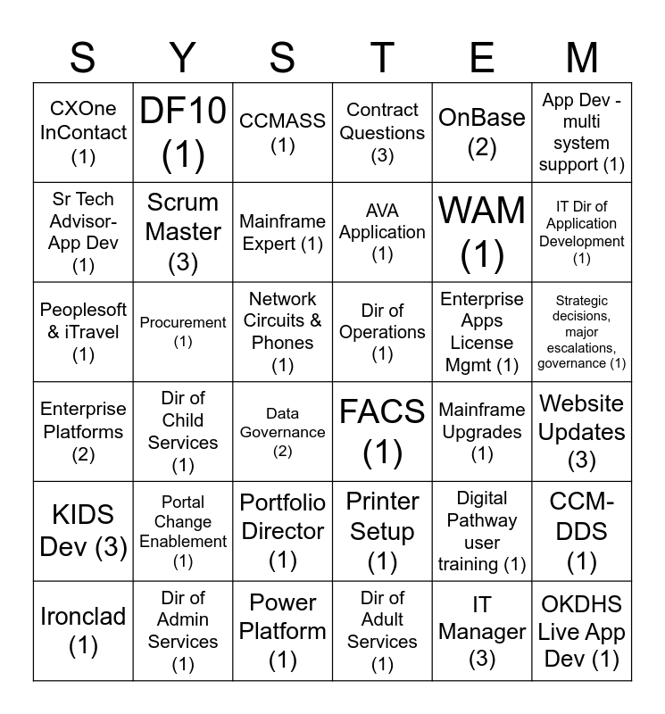 This bingo card has 44 words: Fleet Reservation System (2), Peoplesoft & iTravel (1), SNAP Fraud Prevention Tools (2), Data Governance (2), Printer Setup (1), Website Updates (3), CCMASS (1), KIDS (6), OnBase (2), FACS (1), Contract Questions (3), Procurement (1), Strategic decisions, major escalations, governance (1), Enterprise Apps License Mgmt (1), Power Platform (1), Mainframe Upgrades (1), CCM-DDS (1), WAM (1), Harmony (1), AVA Application (1), DF10 (1), Ironclad (1), Digital Pathway user training (1), CXOne InContact (1), Business Automation (1), Network Circuits & Phones (1), Portal Change Enablement (1), Adobe (1), Enterprise Platforms (2), Dir of Operations (1), Dir of Enterprise & Shared Services (1), Dir of Child Services (1), Dir of Admin Services (1), Dir of Adult Services (1), IT Dir of Application Development (1), Portfolio Director (1), IT Manager (3), KIDS Dev (3), Scrum Master (3), App Dev - multi system support (1), Mainframe Expert (1), OKDHS Live App Dev (1), Sr Tech Advisor-App Dev (1) and CWIS (1).