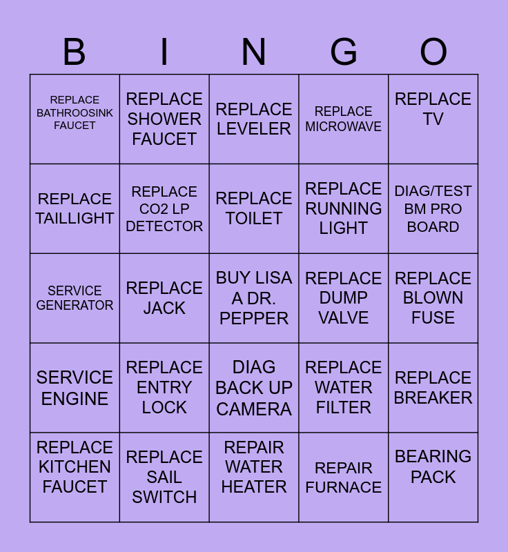 This bingo card has a free space and 24 words: REPLACE ENTRY LOCK, REPLACE SAIL SWITCH, REPLACE TOILET, REPLACE KITCHEN FAUCET, REPLACE TV, REPLACE BATHROOSINK FAUCET, REPLACE TAILLIGHT, REPLACE SHOWER FAUCET, REPLACE DUMP VALVE, DIAG BACK UP CAMERA, REPLACE RUNNING LIGHT, SERVICE GENERATOR, REPLACE WATER FILTER, REPLACE BREAKER, REPLACE CO2 LP DETECTOR, REPAIR FURNACE, REPLACE BLOWN FUSE, REPLACE LEVELER, DIAG/TEST BM PRO BOARD, REPLACE JACK, BEARING PACK, SERVICE ENGINE, REPLACE MICROWAVE and REPAIR WATER HEATER.