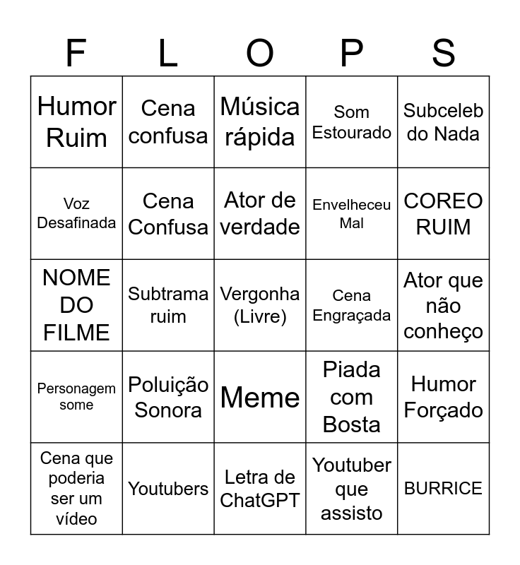 This bingo card has a free space and 24 words: Poluição Sonora, Youtubers, Ator de verdade, Cena que poderia ser um vídeo, Subceleb do Nada, Humor Ruim, Voz Desafinada, Cena confusa, Cena Engraçada, Meme, Envelheceu Mal, NOME DO FILME, Piada com Bosta, Humor Forçado, Cena Confusa, Youtuber que assisto, Ator que não conheço, Música rápida, COREO RUIM, Subtrama ruim, BURRICE, Personagem some, Som Estourado and Letra de ChatGPT.
