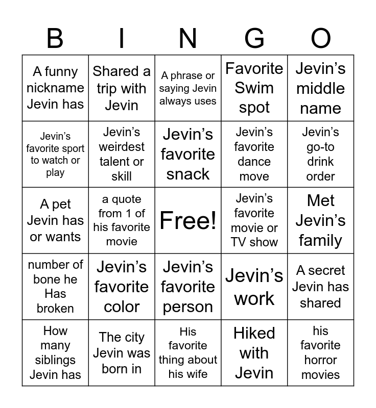 This bingo card has a free space and 24 words: Jevin’s favorite color, The city Jevin was born in, Jevin’s favorite snack, How many siblings Jevin has, Jevin’s middle name, A funny nickname Jevin has, Jevin’s favorite sport to watch or play, Shared a trip with Jevin, Jevin’s favorite movie or TV show, Jevin’s favorite person, Jevin’s favorite dance move, A pet Jevin has or wants, Jevin’s work, A secret Jevin has shared, Jevin’s weirdest talent or skill, Hiked with Jevin, Met Jevin’s family, A phrase or saying Jevin always uses, Jevin’s go-to drink order, a quote from 1 of his favorite movie, his favorite horror movies, number of bone he Has broken, Favorite Swim spot and His favorite thing about his wife.