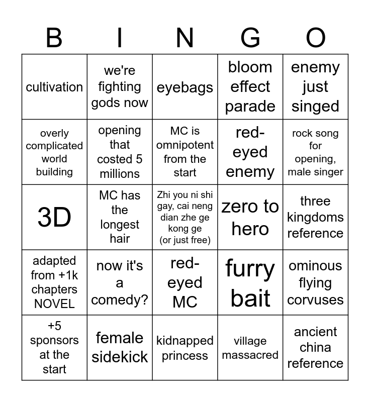 This bingo card has a free space and 24 words: now it's a comedy?, female sidekick, MC is omnipotent from the start, +5 sponsors at the start, enemy just singed, cultivation, overly complicated world building, we're fighting gods now, zero to hero, red-eyed MC, red-eyed enemy, 3D, furry bait, ominous flying corvuses, opening that costed 5 millions, village massacred, three kingdoms reference, eyebags, rock song for opening, male singer, MC has the longest hair, ancient china reference, adapted from +1k chapters NOVEL, bloom effect parade and kidnapped princess.
