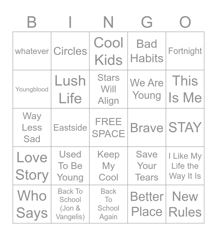 This bingo card has a free space and 75 words: Beautiful Things, I A'int Worried, Cool Kids, Dog Days Are Over, ME!, twilight zone, Friend of Mine, GOOD FEELINGS, As It Was, RUNAWAY, Waffle House, Wake Me Up, Stars Will Align, Youngblood, Be Kind, Eastside, Apple, New Rules, Espresso, Fortnight, Sunflower, Way Less Sad, Lush Life, Circles, Bad Habits, bad guy, Good Life, Bang!, Piece By Piece, Gimme Love, Heat Waves, Youth (Shawn Mendes), Happy, Save Your Tears, This Is Me, We Are Young, Eyes Closed, Lil Bit, STAY, Better Place, We're Going to Be Friends, Illusion, Crowd Go Crazy, Blitzkrieg Bop, Sk8er Boi, YOUTH (Troye Sivan), Who Says, whatever, Don't Give Up On Me, Leave Before You Love Me, Never Let You Down, Keep My Cool, Love Like This, Natural, To The Moon, Funny, Confident, Almost There, Tongue Tied, Cover Me in Sunshine, Used To Be Young, LIFETIMES, I Can, The Way, Steal the Show, Brave, Know No Better, Miss Independent, get him back!, I Like My Life the Way It Is, Love Story, Back To School (Jon & Vangelis), Back to School (Ace Frehley), Back To School Again and Back to School (Cisco Adler).
