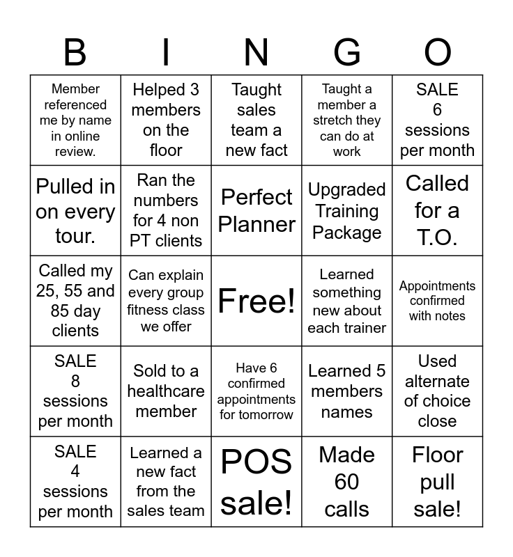 This bingo card has a free space and 24 words: SALE 4 sessions per month, Sold to a healthcare member, Perfect Planner, Made 60 calls, SALE 6 sessions per month, Member referenced me by name in online review., Helped 3 members on the floor, Taught sales team a new fact, Learned something new about each trainer, Appointments confirmed with notes, Called my 25, 55 and 85 day clients, Ran the numbers for 4 non PT clients, Learned 5 members names, Used alternate of choice close, Pulled in on every tour., Learned a new fact from the sales team, POS sale!, Taught a member a stretch they can do at work, Called for a T.O., SALE 8 sessions per month, Can explain every group fitness class we offer, Have 6 confirmed appointments for tomorrow, Upgraded Training Package and Floor pull sale!.