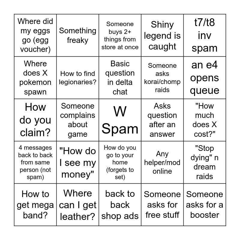 This bingo card has a free space and 24 words: "How do I see my money", Where can I get leather?, Basic question in delta chat, How to get mega band?, t7/t8 inv spam, Where did my eggs go (egg voucher), Where does X pokemon spawn, Something freaky, Asks question after an answer, How do you go to your home (forgets to set), Someone asks korai/chomp raids, How do you claim?, Any helper/mod online, "Stop dying" n dream raids, How to find legionaries?, Someone asks for free stuff, "How much does X cost?", Someone buys 2+ things from store at once, an e4 opens queue, Someone complains about game, Someone asks for a booster, 4 messages back to back from same person (not spam), Shiny legend is caught and back to back shop ads.