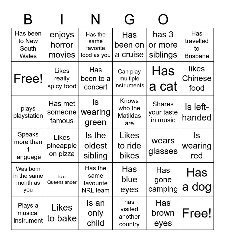 This bingo card has 36 words: Speaks more than 1 language, Likes pineapple on pizza, Is an only child, Can play multiple instruments, Shares your taste in music, Is left-handed, Has been to New South Wales, Likes to bake, Has the same favorite food as you, Has blue eyes, Has a cat, Has travelled to Brisbane, Was born in the same month as you, Has met someone famous, Has been to a concert, Has been on a cruise, Has gone camping, Is wearing red, Free!, Likes really spicy food, Is the oldest sibling, Likes to ride bikes, wears glasses, Has a dog, plays playstation, enjoys horror movies, is wearing green, has visited another country, has 3 or more siblings, likes Chinese food, Plays a musical instrument, Is a Queenslander, Has the same favourite NRL team, Knows who the Matildas are, Has brown eyes and Free!.