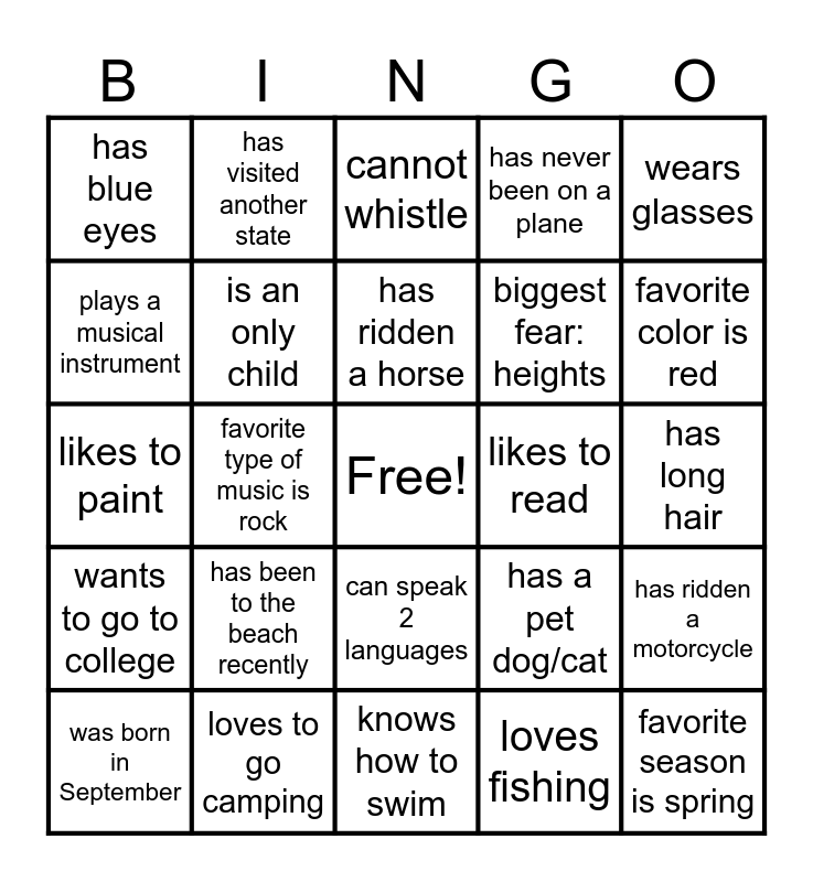 This bingo card has a free space and 24 words: was born in September, has been to the beach recently, has ridden a horse, loves fishing, wears glasses, has blue eyes, has visited another state, cannot whistle, likes to read, has long hair, likes to paint, is an only child, has a pet dog/cat, has ridden a motorcycle, plays a musical instrument, loves to go camping, knows how to swim, has never been on a plane, favorite color is red, wants to go to college, favorite type of music is rock, can speak 2 languages, biggest fear: heights and favorite season is spring.