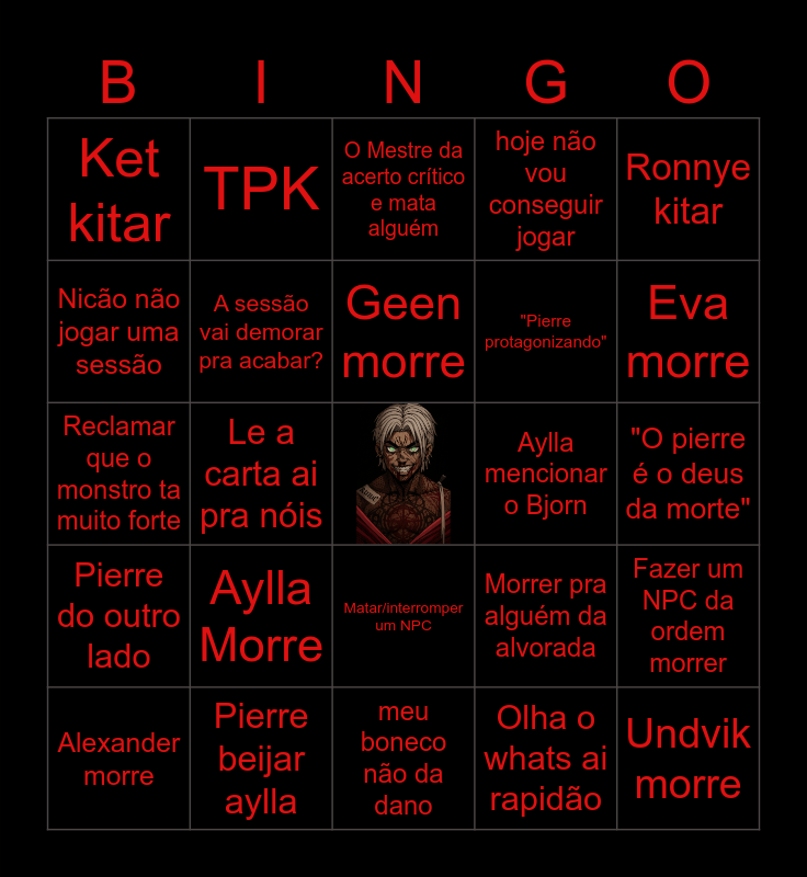 This bingo card has a free space and 24 words: Aylla Morre, Pierre beijar aylla, Geen morre, Alexander morre, Ronnye kitar, Ket kitar, Nicão não jogar uma sessão, TPK, Aylla mencionar o Bjorn, Matar/interromper um NPC, "Pierre protagonizando", Reclamar que o monstro ta muito forte, Morrer pra alguém da alvorada, Fazer um NPC da ordem morrer, A sessão vai demorar pra acabar?, Olha o whats ai rapidão, "O pierre é o deus da morte", O Mestre da acerto crítico e mata alguém, Eva morre, Le a carta ai pra nóis, Undvik morre, Pierre do outro lado, hoje não vou conseguir jogar and meu boneco não da dano.