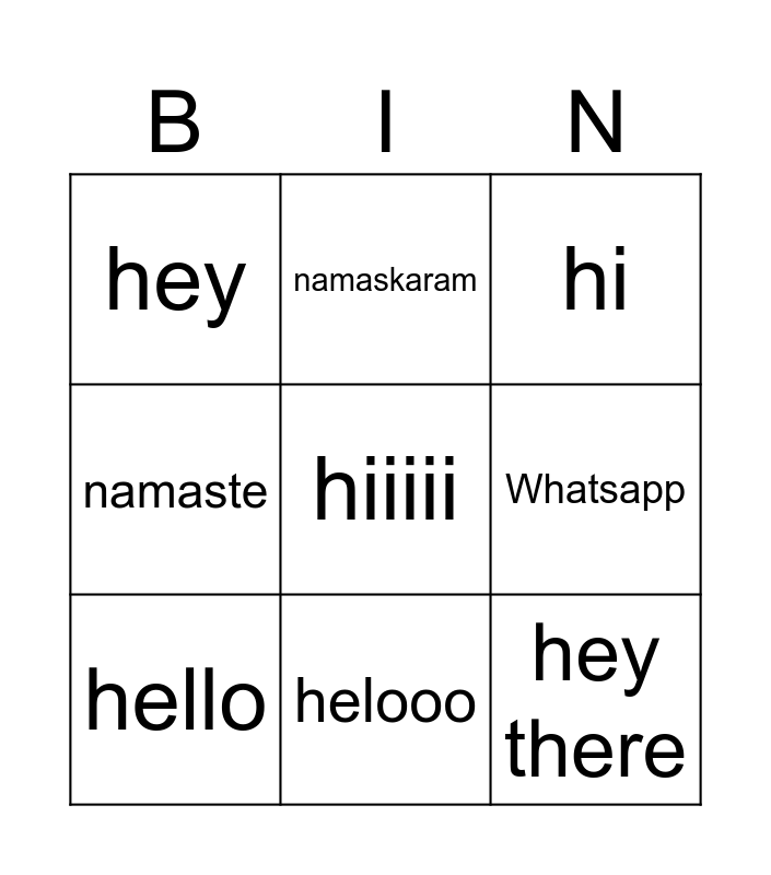 This bingo card has 9 words: hello, hi, namaskaram, namaste, hey, Whatsapp, hiiiii, hey there and helooo.