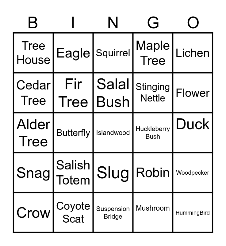 This bingo card has a free space and 35 words: Sword Fern, Spider Web, Pine cone, Fir Tree, Slug, Maple Tree, Cedar Tree, Leaf, Salal Bush, Stinging Nettle, Alder Tree, Lichen, Moss, Blackberry Bush, Tree House, Huckleberry Bush, Mushroom, Butterfly, Snag, HummingBird, Robin, Crow, Woodpecker, Coyote Scat, Squirrel, Flower, Lily Pads, A Bog, Stinging Nettle, Duck, Welcome Center, Suspension Bridge, Salish Totem, Eagle and Owl.