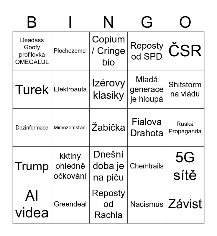 This bingo card has a free space and 24 words: AI videa, kktiny ohledně očkování, Izérovy klasiky, Nacismus, ČSR, Deadass Goofy profilovka OMEGALUL, Plochozemci, Copium / Cringe bio, Fialova Drahota, Ruská Propaganda, Dezinformace, Elektroauta, Chemtrails, 5G sítě, Turek, Greendeal, Reposty od Rachla, Reposty od SPD, Shitstorm na vládu, Trump, Mimozemšťani, Dnešní doba je na piču, Mladá generace je hloupá and Závist.