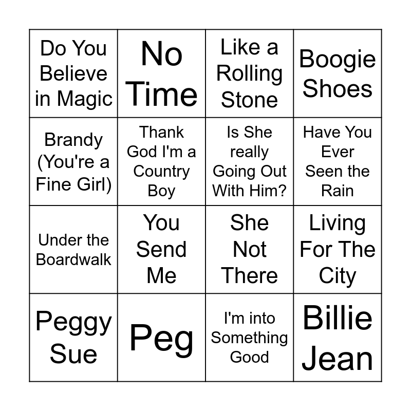 This bingo card has 42 words: Free!, Have You Ever Seen the Rain, Maggie May, For What It's Worth, I Saw Her Standing There, Wild Thing, Peggy Sue, Be My Baby, Like a Rolling Stone, I'm A Believer, I'm into Something Good, You Send Me, Living For The City, Brandy (You're a Fine Girl), Sister Golden Hair, Hey, Soul Sister, Dream Lover, She Not There, We're an American Band, No Time, Thank God I'm a Country Boy, Don't Stop, I'm Still Standing, Do You Believe in Magic, Teach Your Children, It Don't Come Easy, Under the Boardwalk, Come and Get It, Runnin Down a Dream, Cecilia, Listen to the Music, Billie Jean, Is She really Going Out With Him?, Tom Sawyer, Funk #49, Burning Love, In the Summertime, Peg, Happy Together, Here Comes The Sun, Boogie Shoes and Free!.