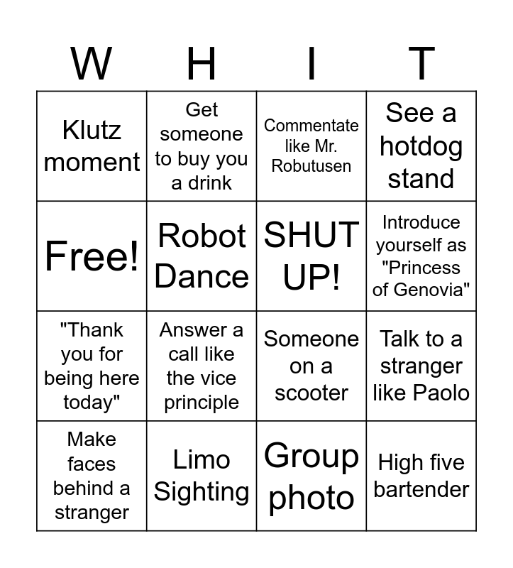 This bingo card has 16 words: Limo Sighting, Talk to a stranger like Paolo, Commentate like Mr. Robutusen, Klutz moment, "Thank you for being here today", Get someone to buy you a drink, Someone on a scooter, Group photo, Free!, Robot Dance, Make faces behind a stranger, See a hotdog stand, Answer a call like the vice principle, Introduce yourself as "Princess of Genovia", SHUT UP! and High five bartender.