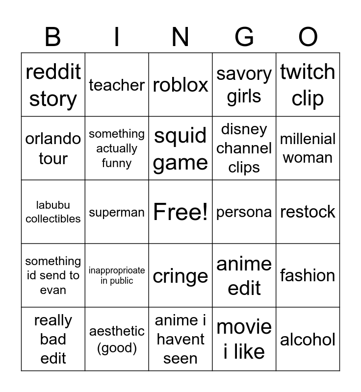 This bingo card has a free space and 24 words: inapproprioate in public, aesthetic (good), squid game, really bad edit, twitch clip, reddit story, orlando tour, teacher, persona, cringe, disney channel clips, labubu collectibles, anime edit, fashion, something actually funny, movie i like, restock, roblox, millenial woman, superman, alcohol, something id send to evan, savory girls and anime i havent seen.