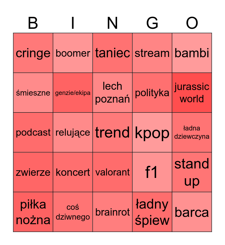 This bingo card has 25 words: koncert, brainrot, lech poznań, piłka nożna, bambi, cringe, śmieszne, boomer, kpop, valorant, polityka, podcast, f1, stand up, genzie/ekipa, barca, ładna dziewczyna, taniec, jurassic world, relujące, trend, coś dziwnego, zwierze, stream and ładny śpiew.