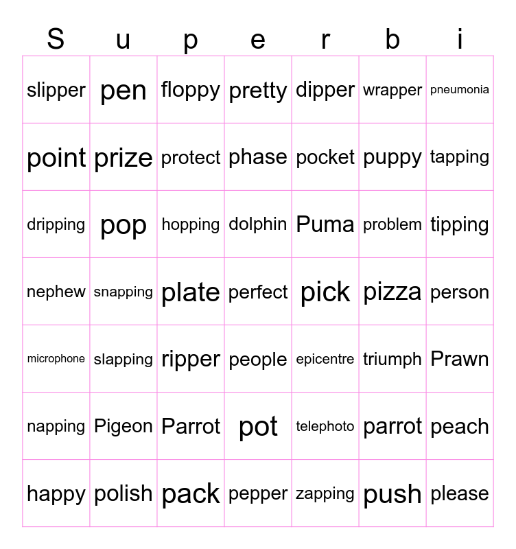 This bingo card has 131 words: pan, pen, pot, pet, pig, pin, pop, pat, pick, pack, park, part, peach, pearl, plant, paint, plate, paper, pencil, party, pizza, puppy, prize, proud, present, person, pocket, parrot, polite, purple, pretty, problem, protect, perfect, planet, power, puddle, pirate, please, plenty, point, paintbrush, plastic, practice, pumpkin, promise, parking, people, picture, polish, prefer, push, pull, phone, photo, graph, elephant, trophy, alphabet, nephew, phantom, microphone, symphony, autograph, orphan, triumph, paragraph, physical, phase, phrase, dolphin, emphasis, telephoto, physics, pharmacy, morph, photograph, epicentre, apple, happy, puppy, poppy, slipper, hopping, shopping, stopping, tapping, clapping, snapping, trapping, flapping, yapping, zapping, supper, pepper, ripper, dipper, zipper, wrapper, mopping, napping, floppy, popping, stepping, slapping, dropping, dripping, chopping, tipping, psychology, pneumonia, psyche, Possum, Platypus, Parrot, Penguin, Potoroo, Pademelon, Pelican, Prawn, Python, Panther, Peacock, Pig, Pigeon, Pony, Puma, Hopping mouse, Copperhead, Elephant and Dolphin.