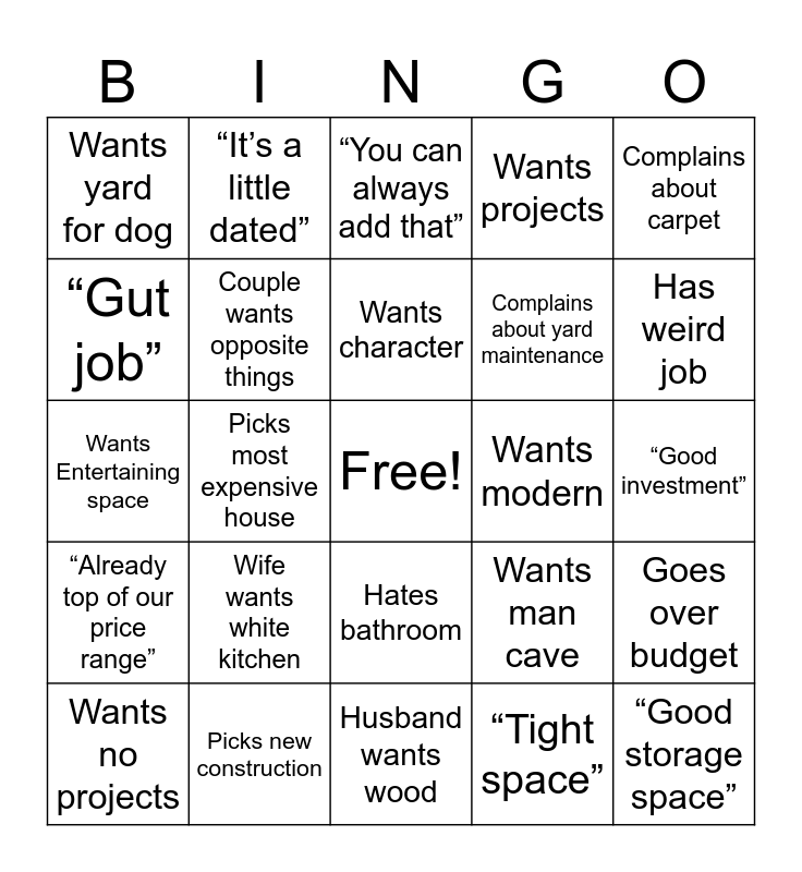 This bingo card has a free space and 24 words: Wife wants white kitchen, Picks new construction, Wants character, Wants no projects, Complains about carpet, Wants yard for dog, “Gut job”, “It’s a little dated”, Wants modern, Hates bathroom, Complains about yard maintenance, Wants Entertaining space, Wants man cave, Goes over budget, Couple wants opposite things, “Tight space”, “Good investment”, “You can always add that”, Has weird job, Picks most expensive house, “Good storage space”, “Already top of our price range”, Wants projects and Husband wants wood.