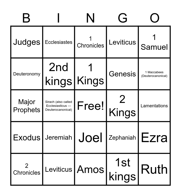 This bingo card has a free space and 59 words: Genesis, Leviticus, Numbers, Exodus, 1st kings, Dueteronomy, 2nd kings, amos, Genesis, Exodus, Leviticus, Numbers, Deuteronomy, Historical Books, Joshua, Judges, Ruth, 1 Samuel, 2 Samuel, 1 Kings, 2 Kings, 1 Chronicles, 2 Chronicles, Ezra, Nehemiah, Tobit (Deuterocanonical), Judith (Deuterocanonical), Esther (Catholic version includes additions), 1 Maccabees (Deuterocanonical), 2 Maccabees (Deuterocanonical), Wisdom Books, Job, Psalms, Proverbs, Ecclesiastes, Song of Songs, Wisdom (Deuterocanonical), Sirach (also called Ecclesiasticus — Deuterocanonical), Prophetic Books, Major Prophets, Isaiah, Jeremiah, Lamentations, Baruch (Deuterocanonical), Ezekiel, Daniel (Catholic version includes additional sections), Minor Prophets, Hosea, Joel, Amos, Obadiah, Jonah, Micah, Nahum, Habakkuk, Zephaniah, Haggai, Zechariah and Malachi.