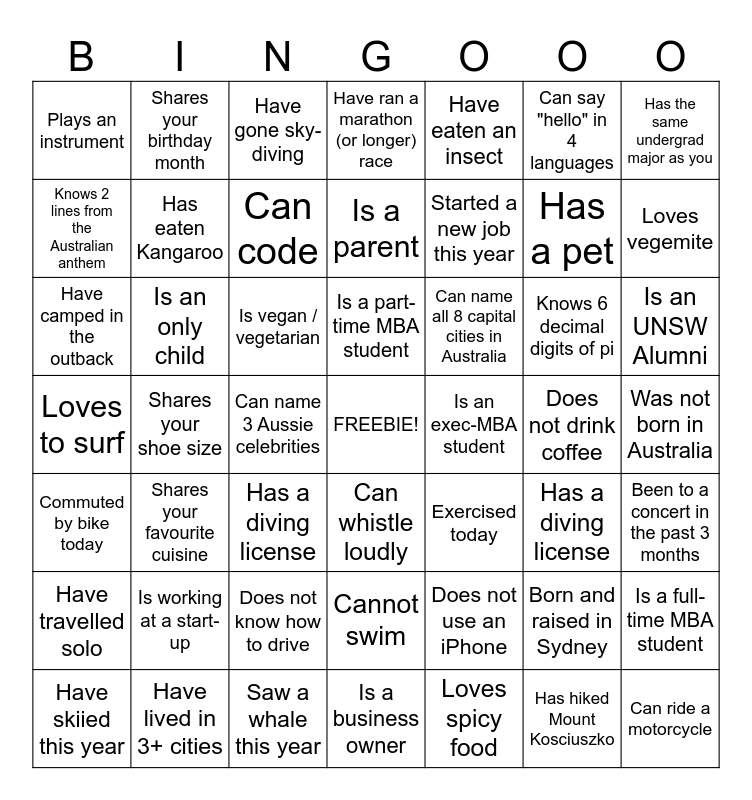 This bingo card has a free space and 49 words: Born and raised in Sydney, Has a pet, Loves spicy food, Shares your shoe size, Is vegan / vegetarian, Was not born in Australia, Shares your birthday month, Saw a whale this year, Can say "hello" in 4 languages, Can whistle loudly, Has the same undergrad major as you, Have ran a marathon (or longer) race, Knows 6 decimal digits of pi, Can name all 8 capital cities in Australia, Is working at a start-up, Does not drink coffee, Knows 2 lines from the Australian anthem, Loves vegemite, Is a full-time MBA student, Have eaten an insect, Started a new job this year, Can name 3 Aussie celebrities, Plays an instrument, Has eaten Kangaroo, Have skiied this year, Can code, Is an UNSW Alumni, Have lived in 3+ cities, Is a part-time MBA student, Is an only child, Has a tattoo, Is an exec-MBA student, Have travelled solo, Does not know how to drive, Loves to surf, Exercised today, Has a diving license, Been to a concert in the past 3 months, Have camped in the outback, Has a diving license, Cannot swim, Commuted by bike today, Can ride a motorcycle, Is a business owner, Is a parent, Have gone sky-diving, Does not use an iPhone, Shares your favourite cuisine and Has hiked Mount Kosciuszko.