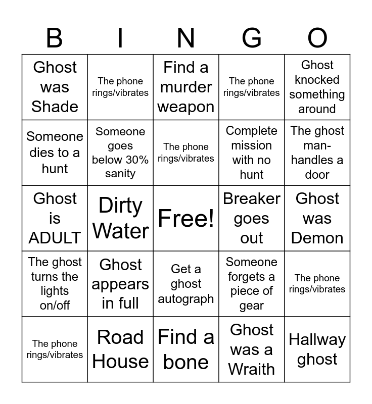 This bingo card has a free space and 29 words: The phone rings/vibrates, Ghost was Yurei, Dirty Water, Ghost whispers, Ghost was Shade, Find a murder weapon, Someone goes below 30% sanity, Ghost appears in full, Breaker goes out, Road House, Ghost was Demon, Hallway ghost, Find a bone, Ghost was a Wraith, The ghost man-handles a door, We find a ouija board, Get a ghost autograph, The ghost turns the lights on/off, Ghost knocked something around, Ghost is ADULT, Someone forgets a piece of gear, Ghost was Oni, Complete mission with no hunt, Someone dies to a hunt, The phone rings/vibrates, The phone rings/vibrates, The phone rings/vibrates, The phone rings/vibrates and The phone rings/vibrates.