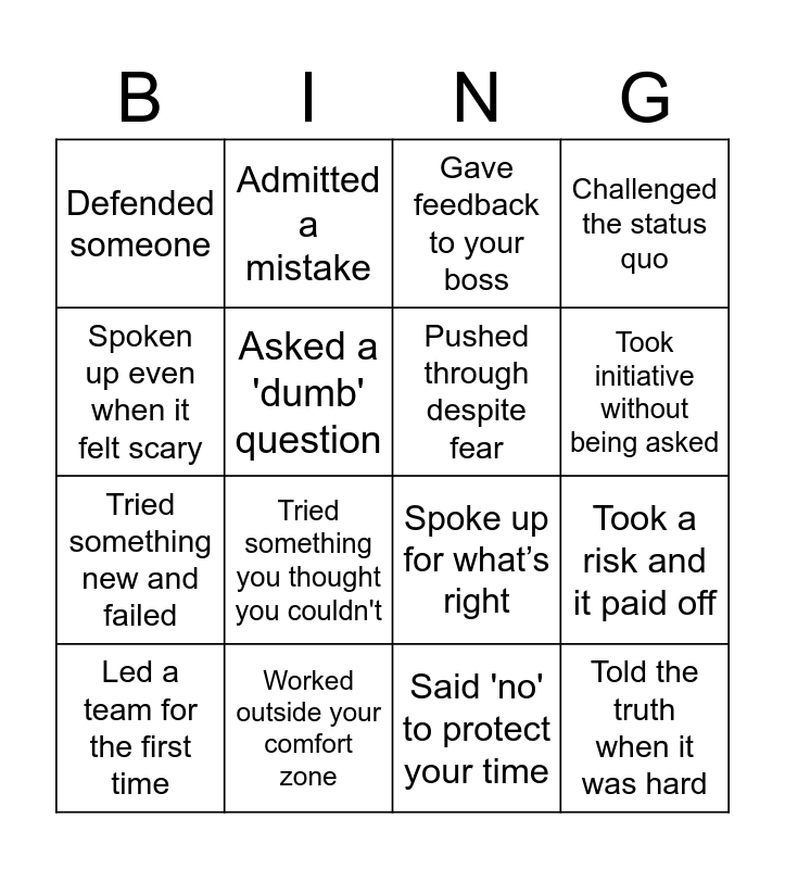This bingo card has 25 words: Free!, Encouraged someone else to be brave, Took initiative without being asked, Asked for help, Spoken up even when it felt scary, Defended someone, Asked a 'dumb' question, Admitted a mistake, Worked outside your comfort zone, Volunteered for something scary, Tried something new and failed, Spoke up for what’s right, Finished a tough task, Admitted I was wrong, Pushed through despite fear, Started over, Said 'no' to protect your time, Gave feedback to your boss, Tried something you thought you couldn't, Took a risk and it paid off, Led a team for the first time, Tried public speaking, Told the truth when it was hard, Challenged the status quo and Stayed calm under pressure.