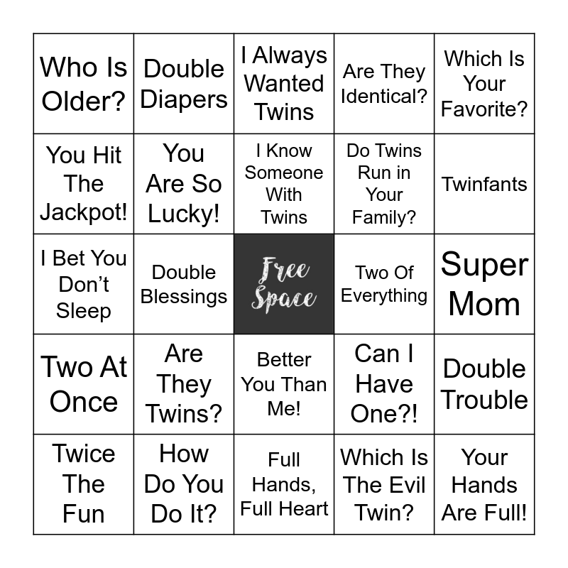 This bingo card has a free space and 24 words: Are They Twins?, How Do You Do It?, I Know Someone With Twins, Twice The Fun, Which Is Your Favorite?, Who Is Older?, You Hit The Jackpot!, Double Diapers, Two Of Everything, Better You Than Me!, Do Twins Run in Your Family?, I Bet You Don’t Sleep, Can I Have One?!, Double Trouble, You Are So Lucky!, Which Is The Evil Twin?, Super Mom, I Always Wanted Twins, Twinfants, Double Blessings, Your Hands Are Full!, Two At Once, Are They Identical? and Full Hands, Full Heart.