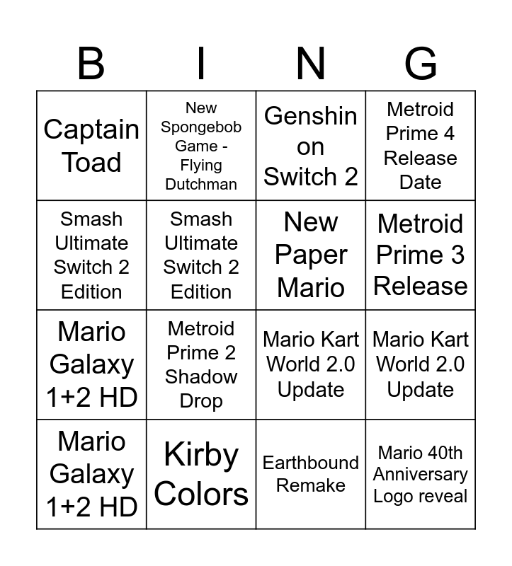 This bingo card has 22 words: Kirby Colors, Pokemon Classics NSO, New Spongebob Game - Flying Dutchman, Metroid Prime 2 Shadow Drop, Smash Ultimate Switch 2 Edition, New Paper Mario, Captain Toad, Genshin on Switch 2, Mario Kart World 2.0 Update, Mario 40th Anniversary Logo reveal, Mario Galaxy 1+2 HD, Metroid Prime 4 Release Date, Splatoon Raiders - coop campaign, New Mario Sunshine Game, Earthbound Remake, Metroid Prime 3 Switch Release Date, Mario Kart World 2.0 Update, Mario Galaxy 1+2 HD, Metroid Prime 2 Shadow Drop, Smash Ultimate Switch 2 Edition, Metroid Prime 3 Release and GenShin on Switch 2.