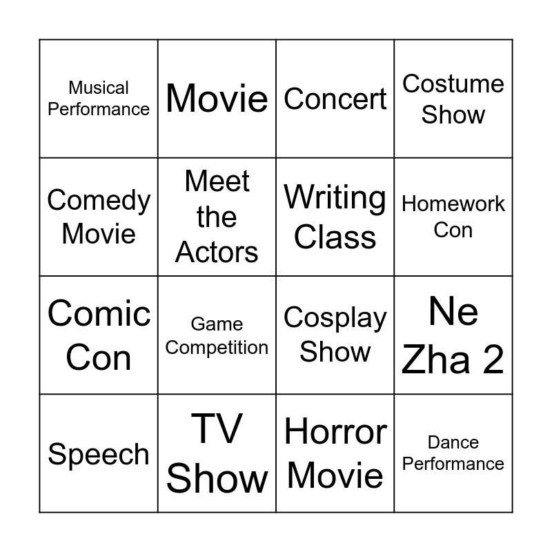 This bingo card has 18 words: Game Competition, Dance Performance, Concert, Musical Performance, Cosplay Show, Costume Show, Speech, Movie, Homework Con, Comic Con, Horror Movie, Comedy Movie, Ne Zha 2, Meet the Actors, Writing Class, Movie Quiz, TV Show and Book Reading.