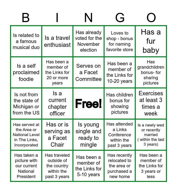 This bingo card has a free space and 29 words: Has served as President in the Chapter, Has traveled outside of the country within the past 3 years, Has already voted for the November election, Serves on a standing committee, Has a fur baby, Is related to a famous musical duo, Has been a member of the Links for 20 or more years, Serves on a Facet Committee, Has children bonus for showing pictures, Is a newly wed or recently married ( within the last 3 years), Has taken a picture with our current National President, Is a current chapter officer, Has recently relocated to the area or purchased a new home, Has been a member of the Links for 3 years or less, Is not from the state of Michigan or from the US, Has recently earned an advanced degree within the past 3 years, Has been a member of the Links for 5-10 years, Has attended a Links Conference within the past 3 years, Has grandchildren bonus- for sharing pictures, Has served at the Area or National Level in The Links, Incorporated, Has or is serving as a Facet Chair, Your favorite season is the fall, Has been a member of the Links for 10-20 years, Exercises at least 3 times a week, Is a self proclaimed foodie, Is a travel enthusiast, Is young single and ready to mingle, Loves to shop - bonus for naming favorite store and Is an avid reader - non work related books.