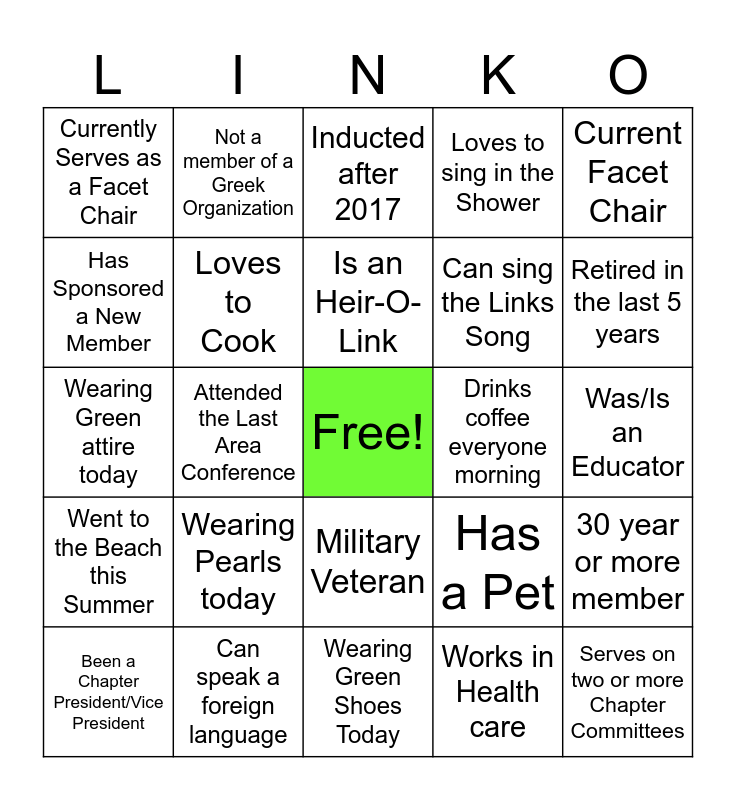 This bingo card has a free space and 24 words: Wearing Pearls today, Can speak a foreign language, Is an Heir-O-Link, Been a Chapter President/Vice President, Current Facet Chair, Currently Serves as a Facet Chair, Has Sponsored a New Member, Not a member of a Greek Organization, Drinks coffee everyone morning, Military Veteran, Can sing the Links Song, Wearing Green attire today, Has a Pet, 30 year or more member, Loves to Cook, Works in Health care, Was/Is an Educator, Inducted after 2017, Retired in the last 5 years, Attended the Last Area Conference, Serves on two or more Chapter Committees, Went to the Beach this Summer, Loves to sing in the Shower and Wearing Green Shoes Today.