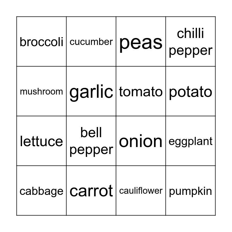 This bingo card has 16 words: carrot, eggplant, peas, broccoli, lettuce, cucumber, onion, cauliflower, mushroom, garlic, cabbage, chilli pepper, bell pepper, potato, tomato and pumpkin.
