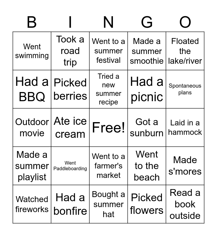 This bingo card has a free space and 24 words: Went Paddleboarding, Had a bonfire, Tried a new summer recipe, Watched fireworks, Floated the lake/river, Went swimming, Had a BBQ, Took a road trip, Got a sunburn, Went to a farmer's market, Had a picnic, Outdoor movie, Went to the beach, Made s'mores, Picked berries, Picked flowers, Laid in a hammock, Went to a summer festival, Spontaneous plans, Ate ice cream, Read a book outside, Made a summer playlist, Made a summer smoothie and Bought a summer hat.