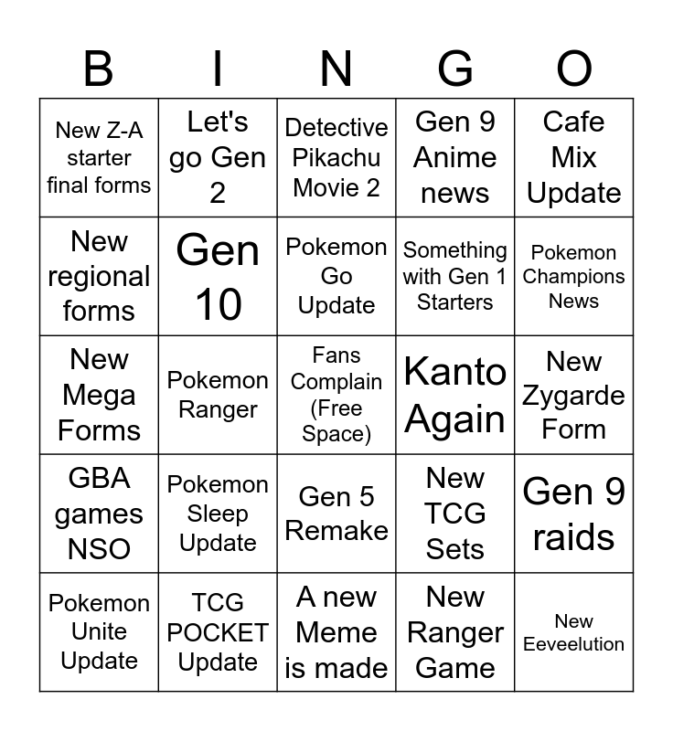 This bingo card has a free space and 24 words: Pokemon Sleep Update, TCG POCKET Update, Pokemon Go Update, Pokemon Unite Update, Cafe Mix Update, New Z-A starter final forms, New regional forms, Let's go Gen 2, Kanto Again, Gen 5 Remake, Something with Gen 1 Starters, New Mega Forms, New TCG Sets, Gen 9 raids, Gen 10, New Ranger Game, New Zygarde Form, Detective Pikachu Movie 2, Pokemon Champions News, Pokemon Ranger, New Eeveelution, GBA games NSO, Gen 9 Anime news and A new Meme is made.