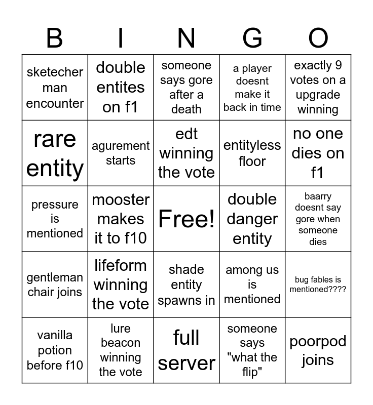 This bingo card has a free space and 24 words: lifeform winning the vote, lure beacon winning the vote, edt winning the vote, vanilla potion before f10, exactly 9 votes on a upgrade winning, sketecher man encounter, rare entity, double entites on f1, double danger entity, shade entity spawns in, entityless floor, pressure is mentioned, among us is mentioned, bug fables is mentioned????, agurement starts, someone says "what the flip", baarry doesnt say gore when someone dies, someone says gore after a death, no one dies on f1, mooster makes it to f10, poorpod joins, gentleman chair joins, a player doesnt make it back in time and full server.
