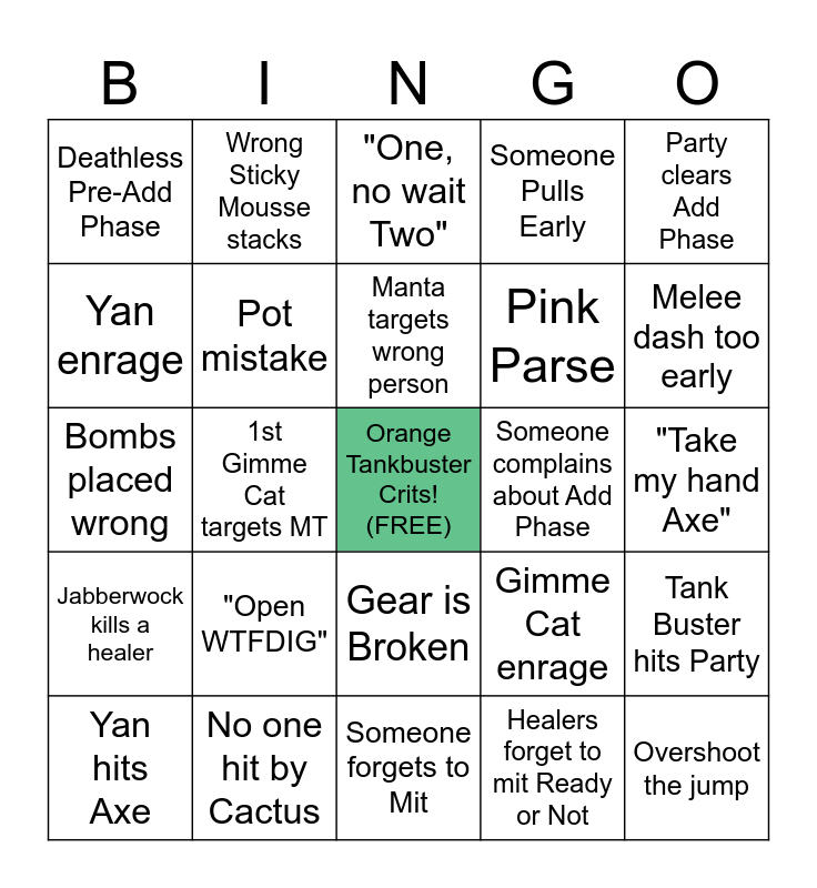 This bingo card has a free space and 27 words: Gimme Cat enrage, Perfect Puddle Drops, Pink Parse, Someone forgets to Mit, Yan enrage, "One, no wait Two", Wrong Sticky Mousse stacks, Jabberwock kills a healer, Someone complains about Add Phase, Tank Buster hits Party, Bombs placed wrong, Someone Pulls Early, Yan hits Axe, No one hit by Cactus, Melee dash too early, "Not you Kat the other cat", Pot mistake, Manta targets wrong person, "Open WTFDIG", Deathless Pre-Add Phase, "Take my hand Axe", Healers forget to mit Ready or Not, 1st Gimme Cat targets MT, Overshoot the jump, Gear is Broken, Party clears Add Phase and "Wall?".