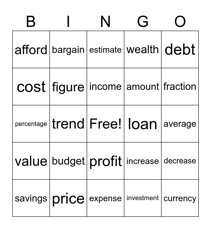 This bingo card has a free space and 25 words: budget, expense, income, savings, debt, afford, cost, bargain, loan, profit, amount, percentage, increase, decrease, figure, total, average, estimate, fraction, trend, currency, price, value, wealth and investment.
