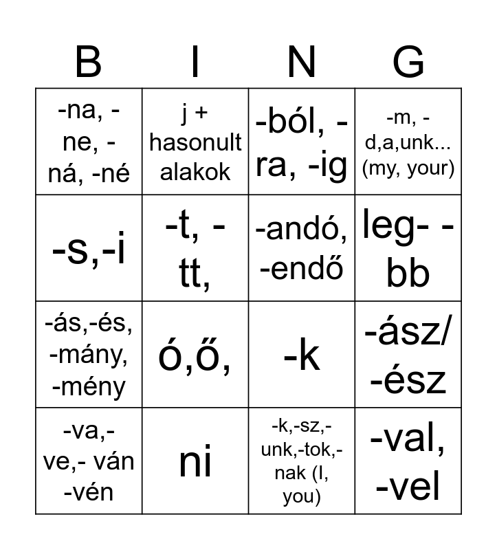 This bingo card has 19 words: -k, -t, -ból, -ra, -ig, -val, -vel, -ász/ -ész, -s,-i, -k,-sz,-unk,-tok,-nak (I, you), -na, -ne, -ná, -né, j + hasonult alakok, -ás,-és, -mány, -mény, ó,ő,, -t, -tt,, -andó, -endő, ni, -va,-ve,- ván -vén, -ság, -ség, -m, -d,a,unk... (my, your), leg- -bb and i,ai, jai, jei.