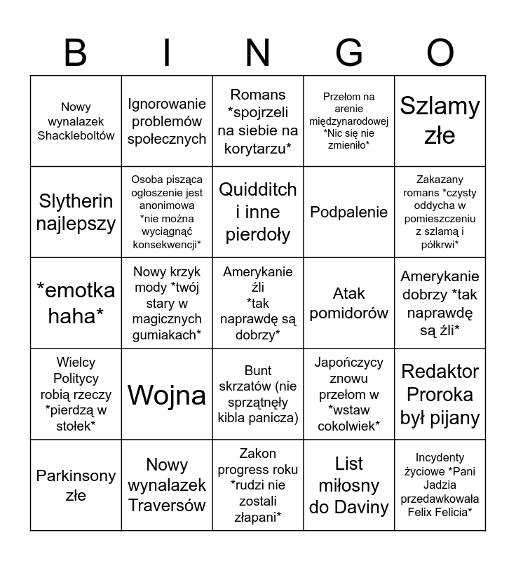 This bingo card has a free space and 24 words: Wojna, Nowy wynalazek Traversów, Quidditch i inne pierdoły, Parkinsony złe, Szlamy złe, Nowy wynalazek Shackleboltów, Slytherin najlepszy, Ignorowanie problemów społecznych, Atak pomidorów, Bunt skrzatów (nie sprzątnęły kibla panicza), Podpalenie, *emotka haha*, Japończycy znowu przełom w *wstaw cokolwiek*, Redaktor Proroka był pijany, Osoba pisząca ogłoszenie jest anonimowa *nie można wyciągnąć konsekwencji*, List miłosny do Daviny, Amerykanie dobrzy *tak naprawdę są źli*, Romans *spojrzeli na siebie na korytarzu*, Zakazany romans *czysty oddycha w pomieszczeniu z szlamą i półkrwi*, Nowy krzyk mody *twój stary w magicznych gumiakach*, Incydenty życiowe *Pani Jadzia przedawkowała Felix Felicia*, Wielcy Politycy robią rzeczy *pierdzą w stołek*, Przełom na arenie międzynarodowej *Nic się nie zmieniło* and Zakon progress roku *rudzi nie zostali złapani*.