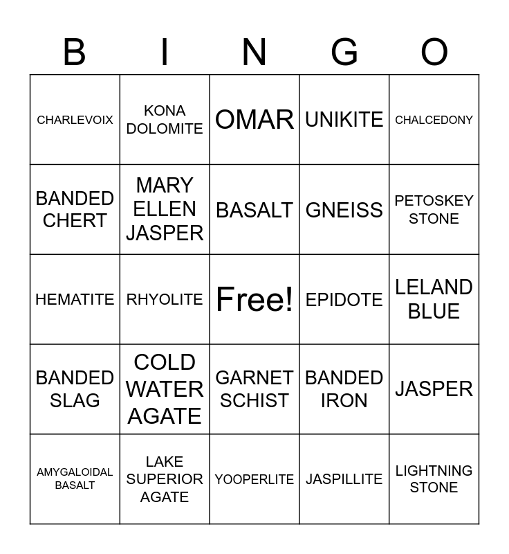 This bingo card has a free space and 24 words: COLD WATER AGATE, LAKE SUPERIOR AGATE, BASALT, AMYGALOIDAL BASALT, CHALCEDONY, CHARLEVOIX, BANDED CHERT, KONA DOLOMITE, EPIDOTE, GARNET SCHIST, GNEISS, HEMATITE, BANDED IRON, JASPER, MARY ELLEN JASPER, JASPILLITE, LELAND BLUE, OMAR, PETOSKEY STONE, RHYOLITE, LIGHTNING STONE, BANDED SLAG, UNIKITE and YOOPERLITE.