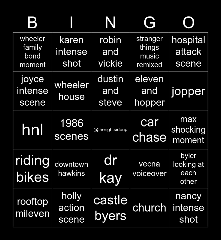 This bingo card has a free space and 24 words: downtown hawkins, holly action scene, dustin and steve, rooftop mileven, hospital attack scene, wheeler family bond moment, joyce intense scene, karen intense shot, car chase, dr kay, eleven and hopper, hnl, vecna voiceover, byler looking at each other, wheeler house, church, max shocking moment, robin and vickie, jopper, 1986 scenes, nancy intense shot, riding bikes, stranger things music remixed and castle byers.