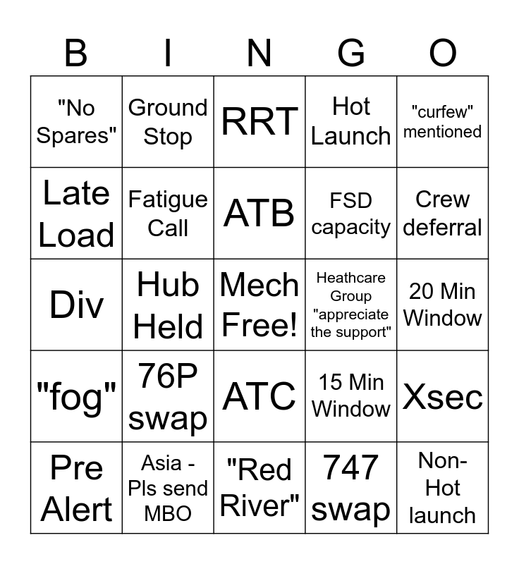 This bingo card has a free space and 44 words: M1F swap, 76P swap, A30 swap, 747 swap, 75P swap, Robert posts a Gif, Fatigue Call, Sick Call, Hot Launch, Non-Hot launch, "No Spares", Asia - Pls send MBO, 15 Min Window, 20 Min Window, Need an alternate, BGR fog, "Red River", Heathcare Group "appreciate the support", Daily Ops Waves in "The Bridge Chat", Div, Ground Stop, ATC, Airborne Holding, "curfew" mentioned, Ops Ban, RTR, ATB, RTO, Xsec, Pre Alert, Primary Alert, RRT, Eqt Chg (upsize), Eqt Chg (downsize), "fog", "low ceilings", "scheduled Maintenance", JA for a crew, Crew deferral, Late Load, Hub Held, post an ED for ltin sm acft, FSD capacity and cnl a flt (not the hot_.