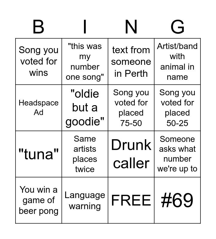 This bingo card has 28 words: Free!, "shoulda been higher", "tuna", Heavy Metal played, "oldie but a goodie", text from someone in Perth, "this was my number one song", #69, Language warning, c-bomb either on air or in song, Drunk caller, Artist/band with animal in name, Wa artist/band, Triple J host pushes merch, Same artists places twice, Halfway song #50, Song you voted for placed 100-75, Song you voted for placed 75-50, Song you voted for placed 50-25, Song you voted for place 25-1, Song you voted for wins, Triple J says votes were so close, You win a game of beer pong, Someone asks what number we're up to, FREE, Band/artist thanks voters, Headspace Ad and We are Mobilise Ad.