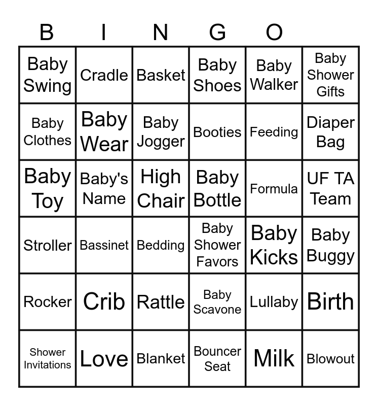 This bingo card has 60 words: Registry, Baby Shower Favors, Baby Bath, Baby Bottle, Baby Buggy, Baby Carrier, Baby Clothes, Baby Food, Baby Jogger, Bath-Time, Baby Shoes, Baby Shower, Baby Shower Gifts, Shower Invitations, Baby Sitter, Baby Swing, Baby Toy, Baby Walker, Baby Shower Games, Baby Wear, Baby's Name, Basket, Bedding, Bassinet, Bottle, Love, Lullaby, Bibs, Booties, Bouncer Seat, Cravings, Car Seat, Changing Table, Cloth Diaper, Cradle, Crib, Diapers, Diaper Bag, Blanket, Feeding, Ultrasound, Formula, High Chair, Infant Carrier, Stroller, Baby Scavone, Team Boy, Team Girl, Jan 2024, UF TA Team, Baby Kicks, Crawl, Blowout, Rattle, Birth, Milk, Swaddle, Nursing, Rocker and Going Home.