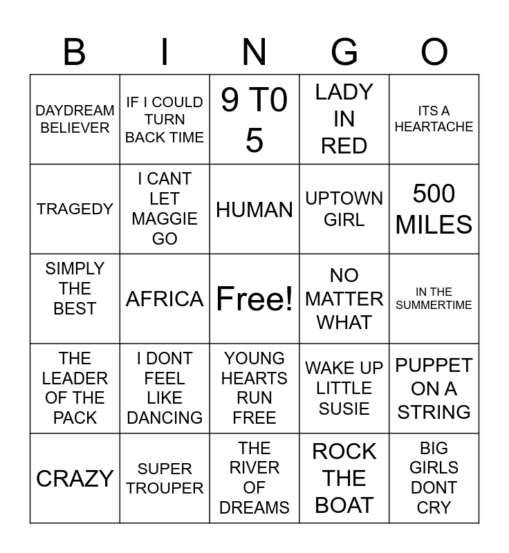 This bingo card has a free space and 44 words: SHINE, BIG GIRLS DONT CRY, STUPID CUPID, CRAZY, IT STARTED WITH A KISS, ROCK THE BOAT, 9 T0 5, DONT LEAVE ME THIS WAY, ITS A HEARTACHE, SUPER TROUPER, LADY IN RED, NO MATTER WHAT, YOUNG HEARTS RUN FREE, I DONT FEEL LIKE DANCING, MOVING ON UP, THE RIVER OF DREAMS, CALINDER GIRL, SIMPLY THE BEST, ALL MY LOVING, 500 MILES, IF I COULD TURN BACK TIME, A GOOD HEART, FERNANDO, DAYDREAM BELIEVER, LOVE OF THE COMMON PEOPLE, IN THE SUMMERTIME, HI HO SILVER LINING, RELIGHT MY FIRE, WAKE UP LITTLE SUSIE, THE LEADER OF THE PACK, FOLSOM PRISON BLUES, PUPPET ON A STRING, THATS MY GOAL, SEXY EYES, AFRICA, BACK TO BLACK, AMERICAN PIE, GLORIA, HUMAN, TRAGEDY, UPTOWN GIRL, CHAIN REACTION, I CANT LET MAGGIE GO and CRAZY WORLD.