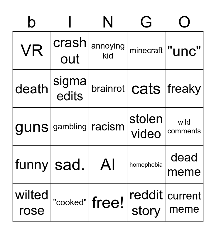 This bingo card has a free space and 24 words: sad., "cooked", brainrot, wilted rose, "unc", VR, death, crash out, stolen video, AI, cats, guns, homophobia, dead meme, sigma edits, reddit story, wild comments, annoying kid, freaky, gambling, current meme, funny, minecraft and free!.