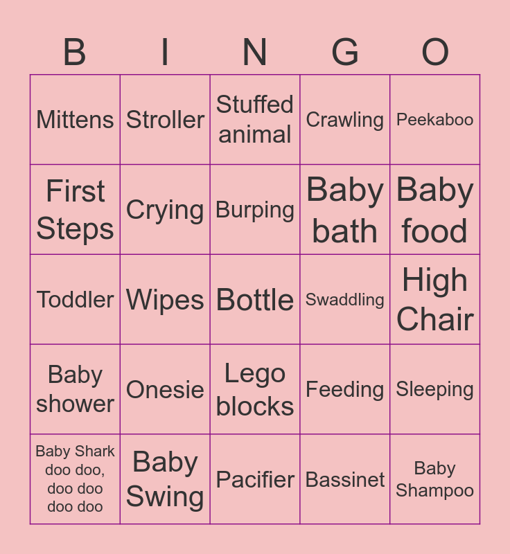 This bingo card has 50 words: Diaper, Bottle, Bib, Pacifier, Onesie, Crib, Stroller, Blanket, First Steps, First Word, Crying, Crawling, Sleeping, Feeding, Bath Time, Teething, Burping, Swaddling, Lullaby, Peekaboo, Wipes, Bassinet, Mittens, Baby bath, Baby Lotion, Baby Shampoo, Baby food, Toy, Stuffed animal, Lego blocks, Play mat, Chubby cheeks, Nursery, Baby oil, Baby Swing, Play- Pen, Baby Book, Burp Cloth, Baby Socks, High Chair, Pajamas, Story time, Rattle, Teething ring, Baby Shark doo doo, doo doo doo doo, Toddler, Rocking chair, Formula, Baby shower and Tummy time.