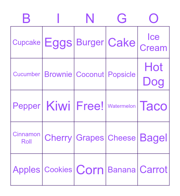 This bingo card has a free space and 43 words: Broccoli, Carrot, Peas, Apples, Strawberry, Banana, Burger, Fries, Ice Cream, Cookies, Cake, Watermelon, Grapes, Cherry, Donut, Corn, Tomato, Pepper, Pizza, Hot Dog, Eggs, Cupcake, Pineapple, Cupcake, Pear, Taco, Orange, Pie, Cheese, Cinnamon Roll, Popcorn, Bagel, S'more, Kiwi, Sushi, Lemon, Blueberry, Coconut, Cucumber, Popsicle, Raspberry, Brownie and Muffin.